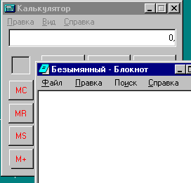 Итак, Windows получает сообщения от устройств типа клавиатуры, мыши, таймера и так далее. Естественно, что у каждого этого устройства есть драйвер, который и умеет сам работать с оборудованием. Сообщение попадает в очередь Windows, из которой уже сообщение передается в очередь сообщений приложения. Само приложение уже выбирает сообщения, используя GetMessage(). Как Windows узнает кому надо оправить сообщение, то есть в чью очередь??? Для клавиатуры и мыши просто. У кого фокус ввода, тот и получит сообщение. На картинке ниже сообщения от клавиатуры будет получать блокнот. Он сверху и у него фокус.